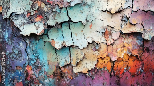 Close-up of a wall with vibrant, cracked, and peeling paint in multiple colors, creating a textured, weathered surface with artistic appeal.