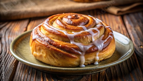 Close-up of a warm, fluffy cinnamon bun on a plate