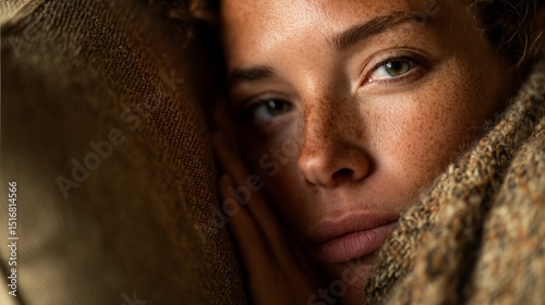 Close-up of a weary woman resting on a sofa with a blanket, sunlight softly illuminating her tired face,