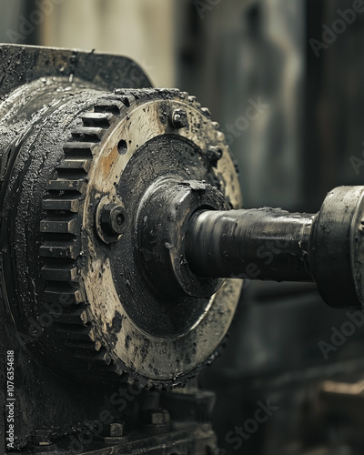 close-up of a weathered industrial lathe with exposed gears and shafts, showing signs of heavy use