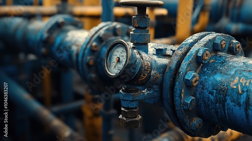 Close-up of a weathered industrial pipeline with yellow valves and a pressure gauge, captured in an outdoor setting during overcast conditions