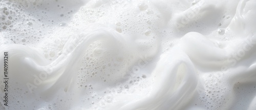 Close-up of a white liquid, which appears to be soap or milk. the texture of the liquid is smooth and creamy, with small bubbles scattered throughout.