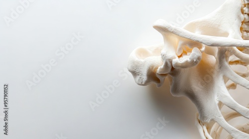 Close-up of a white plastic human skeleton model, isolated on a white background.