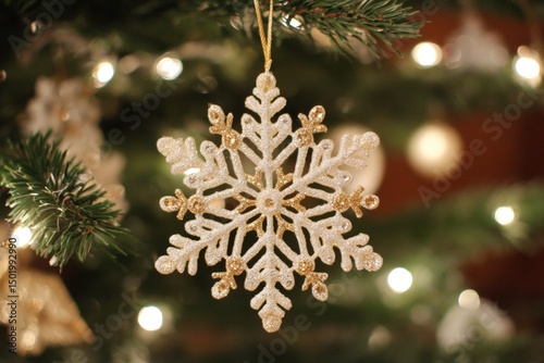 Close-up of a white snowflake ornament hanging on a green Christmas tree with blurred holiday lights.