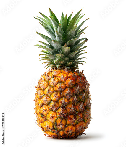 Close-up of a whole ripe pineapple displaying detailed spiky skin and vibrant colors, isolated on white background.