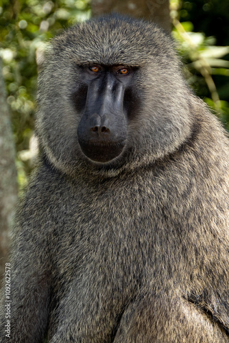 Close-up of a wild baboon in its natural forest habitat. The baboon’s intense gaze and detailed fur textures are highlighted, creating a striking wildlife portrait.