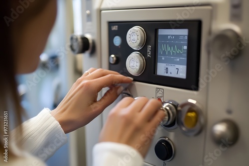 Close-up of a woman adjusting the controls of a medical machine with focus
