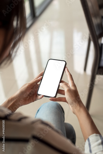 Close-up of a woman hand holding a smartphone blank white screen work concept. Mock up.