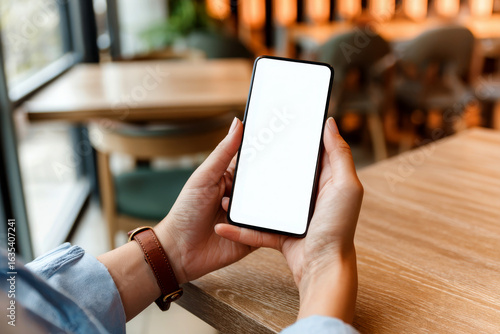 Close-up of a woman hand holding a smartphone white screen is blank the background is blurred restaurant.