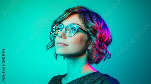 Close-up of a woman in futuristic glasses glowing with digital patterns. An inspiring representation of AI-driven style, innovation, and tech-savvy trends.