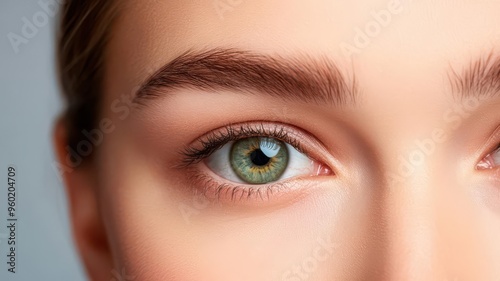 Close-up of a woman s focused eyes during a yoga pose, intense discipline, soft studio lighting