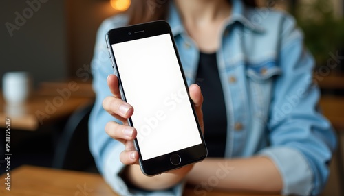 Close-up of a woman showing a smartphone with a blank screen at a cafe table.