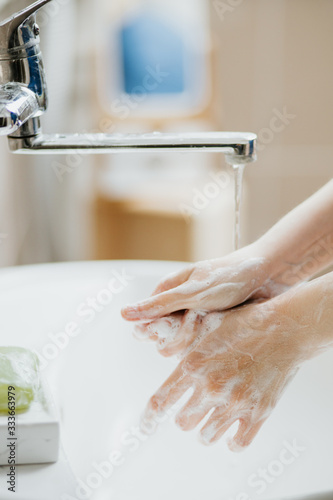 Closeup of a woman washing her hands in bathroom to prevent Covid-19 viral infection. Recommended washing with soap and running water during coronavirus pandemic.