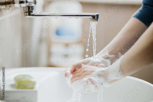 Closeup of a woman washing her hands in bathroom to prevent Covid-19 viral infection. Recommended washing with soap and running water during coronavirus pandemic.
