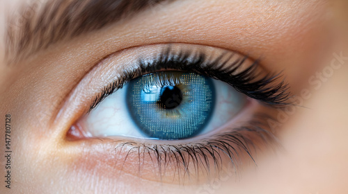 Close-up of a Woman's Bright Blue Eye with Detailed Iris and Long Eyelashes