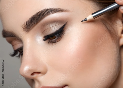 Close-up of a woman's eye with eyebrow pencil application, natural makeup detail, beauty and cosmetics concept, precision and definition, professional makeup, studio photography, subtle and elegant.