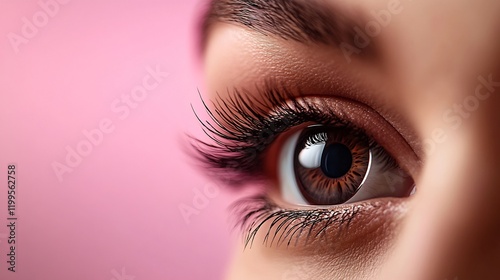 Close-up of a Woman's Eye with Long Eyelashes Against a Pink Background