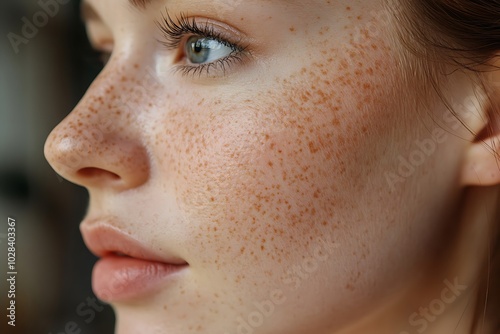 Close-up of a Woman's Face with Freckles and Blue Eyes.