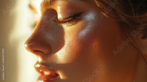 Close-up of a woman's face with glowing skin illuminated by warm sunlight during the golden hour