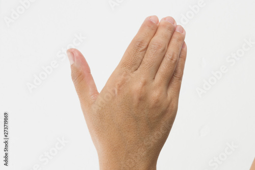 Close-up of a woman's hand and finger on white background