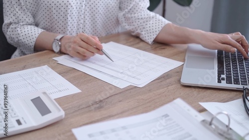 Close-up of a woman's hand checking financial paper beside a laptop on the wooden desk. Bookkeeping, finance audit and taxes