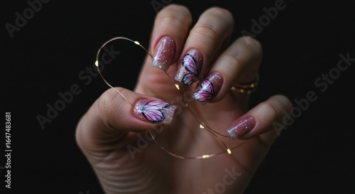 Close-up of a woman's hand with artistic butterfly wing nail art, holding glowing fairy lights against a black background.