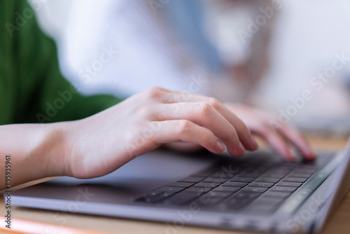 Close-up of a woman's hands typing on a laptop in a modern office setting The focus is on her hands and the technology used for work
