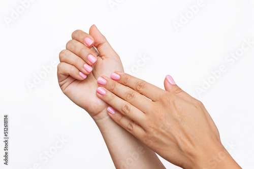 Close-up of a woman's hands with a perfect professional delicate pink manicure isolated on a white background. Nail polish
