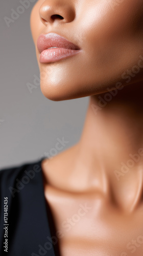 Close-up of a woman's lips, jawline, and smooth skin with soft lighting.