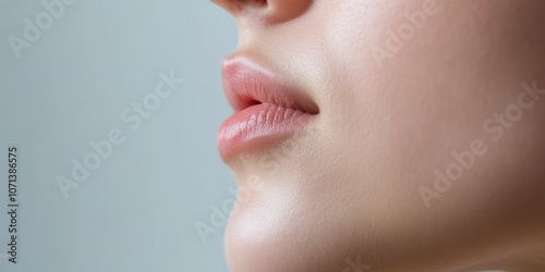 Close-up of a woman’s lower face, emphasizing smooth lips and soft skin on a neutral background.