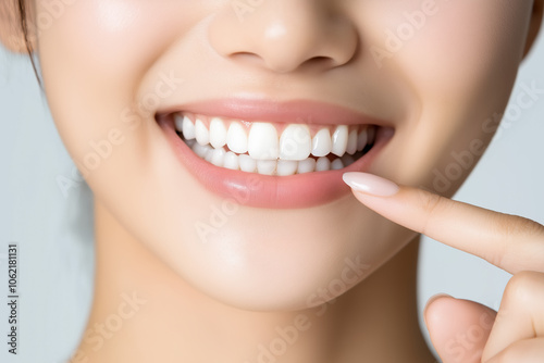 Close-up of a woman’s mouth showing a bright, white smile, with her finger gently pointing at her teeth isolated on white