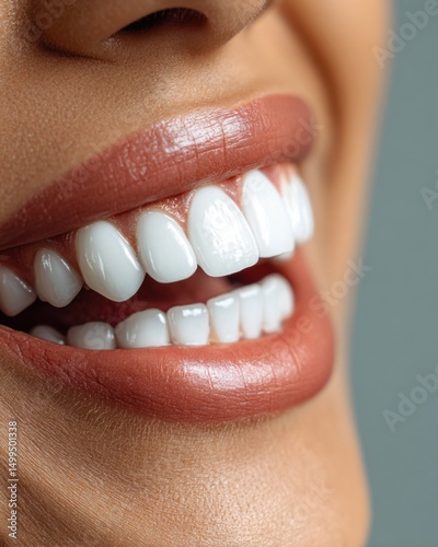 Close-up of a Woman's Perfect Smile Showing White Teeth and Pink Lips in a Beauty Shot with a Gray Background