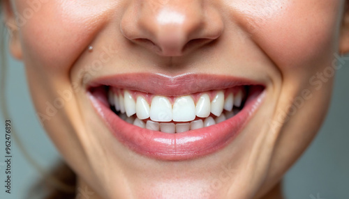 Close-up of a woman's radiant smile, showcasing clean, gleaming teeth and beautifully shaped lips against a white background.