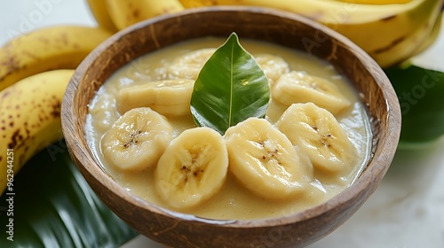 Close-up of a wooden bowl filled with sliced bananas and cream, topped with a green leaf, on a white surface.