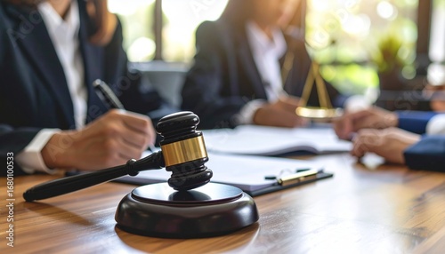 Close-up of a wooden judge hammer resting on a court desk, with a writing lawyer in the blurry background