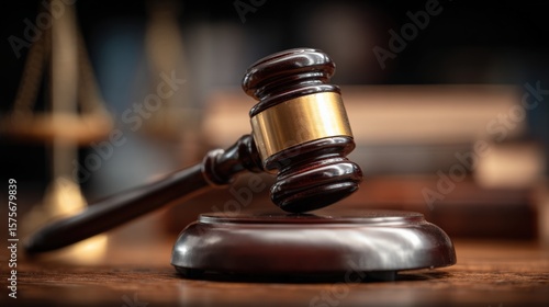 Close-up of a wooden judge's gavel with a golden band resting on a sound block in a legal courtroom setting