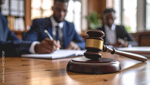 Close-up of a wooden judge's hammer resting on a court desk, with a writing lawyer in the blurry background