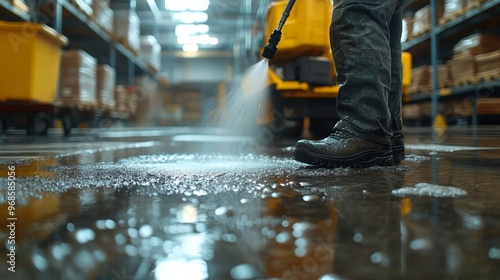 Close-up of a worker cleaning a gritty warehouse floor with a high-pressure washer, water forcefully removing dirt, and creating reflective puddles