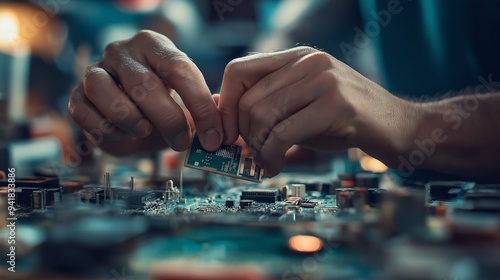 close-up of a worker's hands, carefully assembling a small component