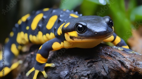 Close-Up of a Yellow and Black Salamander on a Dark Wood Branch