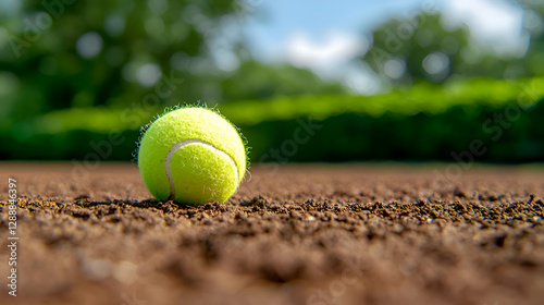 Closeup of a Yellow Tennis Ball on a Brown Clay Court
