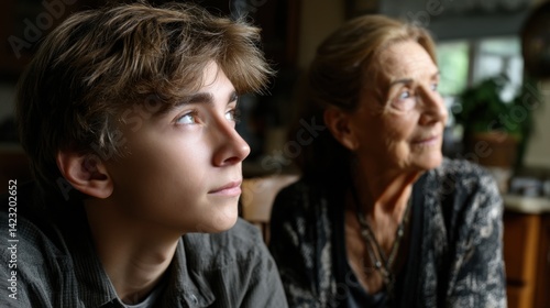 Close-up of a young boy and an elderly woman with thoughtful expressions in a cozy home setting