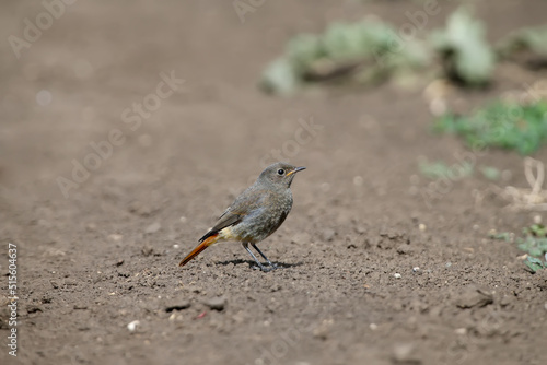 Close-up of a young common redstart (Phoenicurus phoenicurus) standing on the ground and looking at the photographer. Close-up photo with plumage details