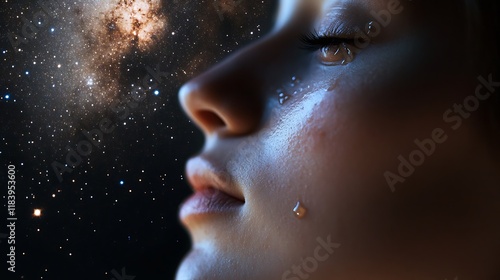 Close-up of a young girl crying, with a starry night sky in the background.