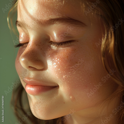 "Close-up of a Young Girl with Glowing Skin and Closed Eyes, Sunlit Natural Beauty Concept
