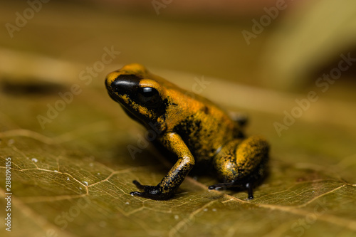 Closeup of a young golden poison frog on a leaf