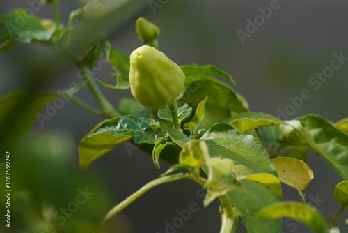 Close-up of a Young Green Chili Pepper Bud on a Plant Branch.