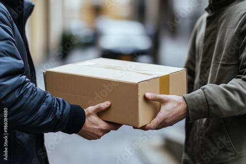 Close-up of a young man giving a package to a deliveryman with a notepad for a signature