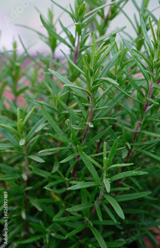 Close-up of a young rosemary plant. Vertical crop. Close up.