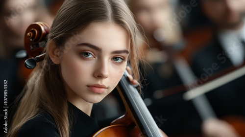 Close-up of a young woman playing the cello during a classical concert, capturing her expression and technique